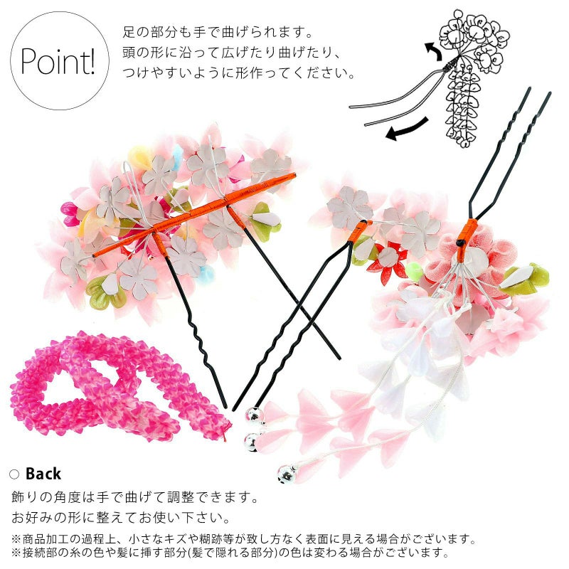 ◇かんざしの足は、お子様の頭に沿うように曲げてご使用ください。また、お花、房飾り、ビラカン等のパーツは多少動かせますので、髪型に合わせて調整してください。