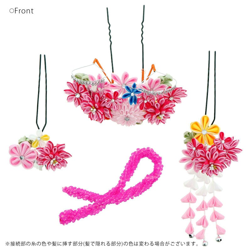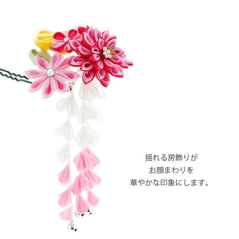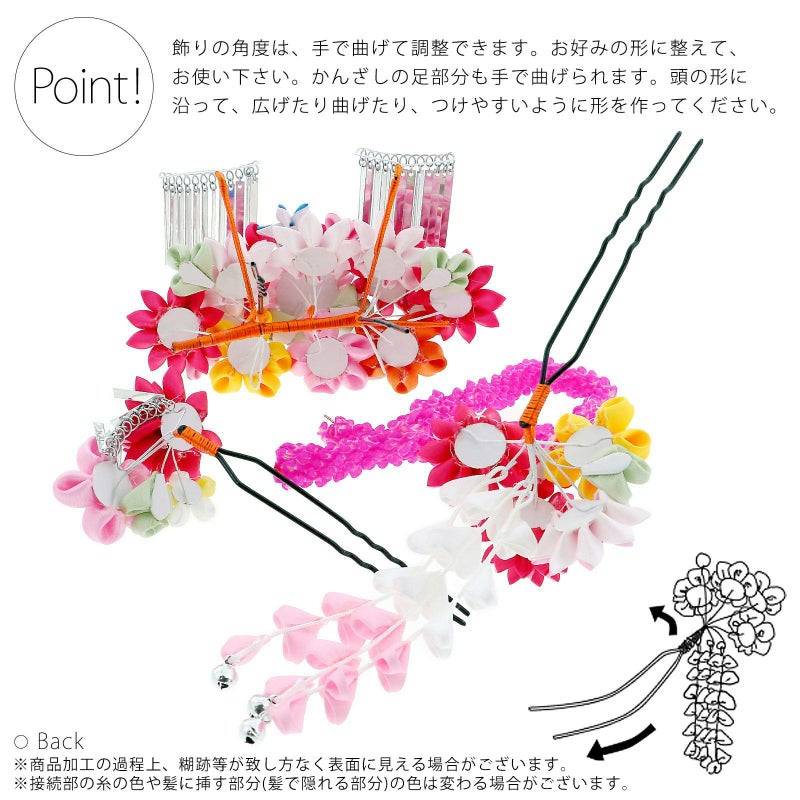 ◇かんざしの足は、お子様の頭に沿うように曲げてご使用ください。また、お花、房飾り、ビラカン等のパーツは多少動かせますので、髪型に合わせて調整してください。