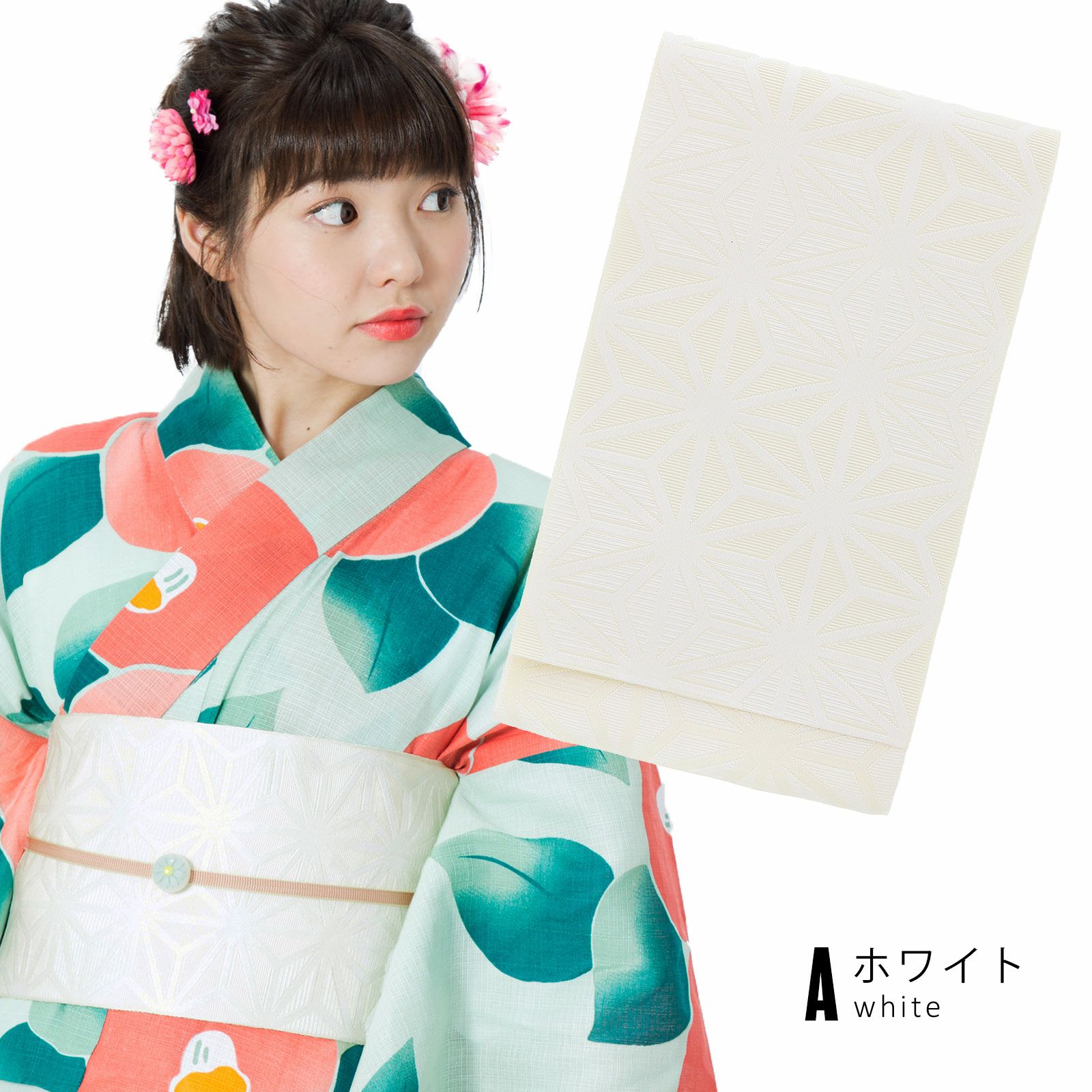 Aホワイト…やや生成りがかった白の帯です。爽やかな色合いの浴衣や暗色の浴衣にコーディネートしやすい万能帯です。