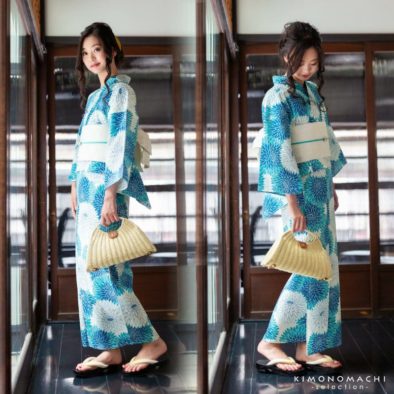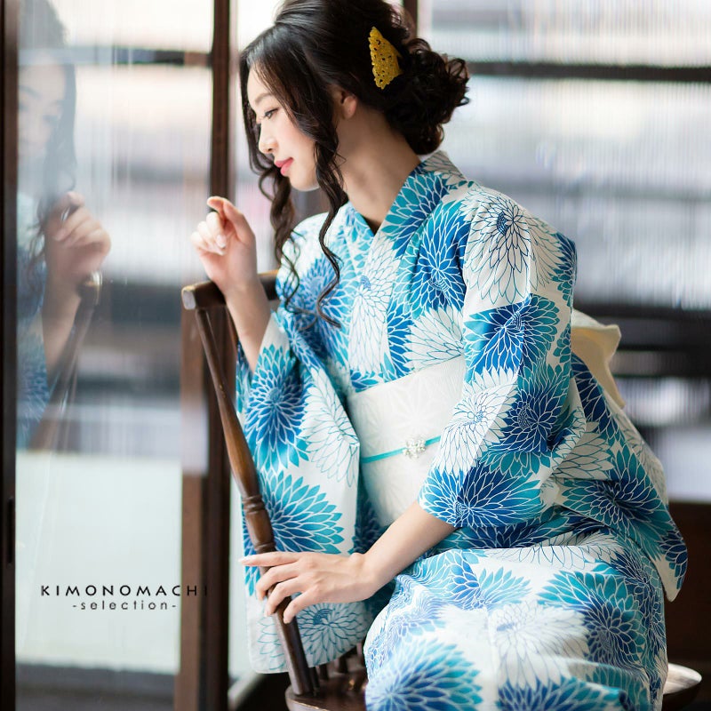 浴衣:ごく薄い生成り地に、ブルー系の色合いの丸菊模様。