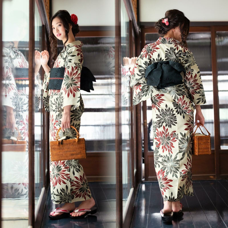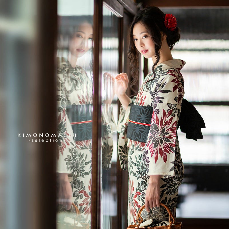 浴衣:クリーム色地に、深い赤や黒、グレーの濃淡の大きな菊の花。シックな色合いですが、花火のように広がる沢山の菊の花びらが豪華です。