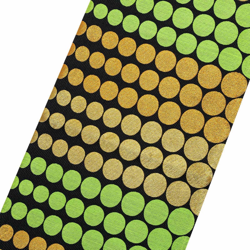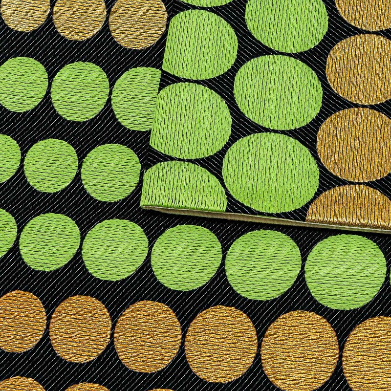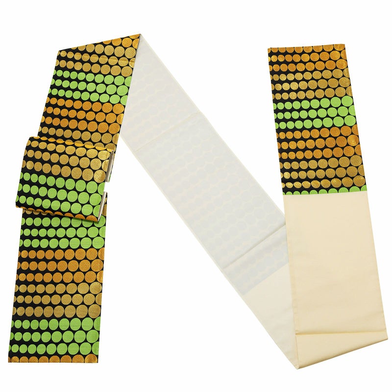 【色柄】黒色の地に、大きさに変化を付けたドット柄の帯。金色、金茶色、明るい黄緑色。黒の地と色彩のコントラストが美しく、個性的な装いに。
