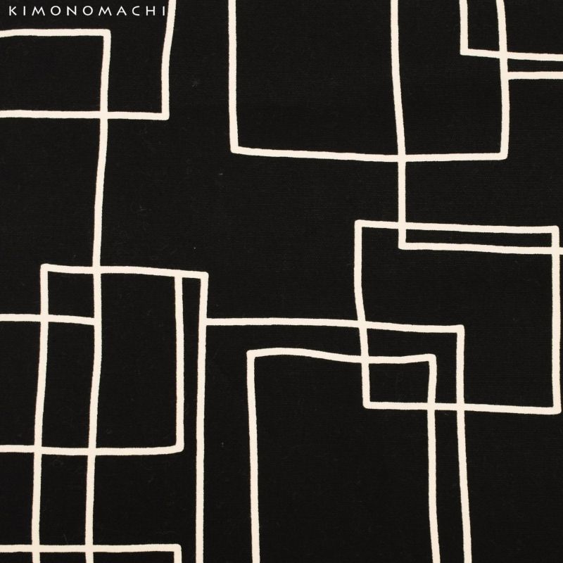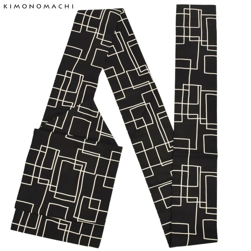 【色柄】黒地に、白に近い生成り色のラインのランダムなスクエア柄。手描き風のゆらぎのある線がシャープになりすぎない味わいを添えています。綿ですのでしなやかで滑りにくく、お太鼓以外の変わり結びにも◎気軽に楽しんでいただける帯です。