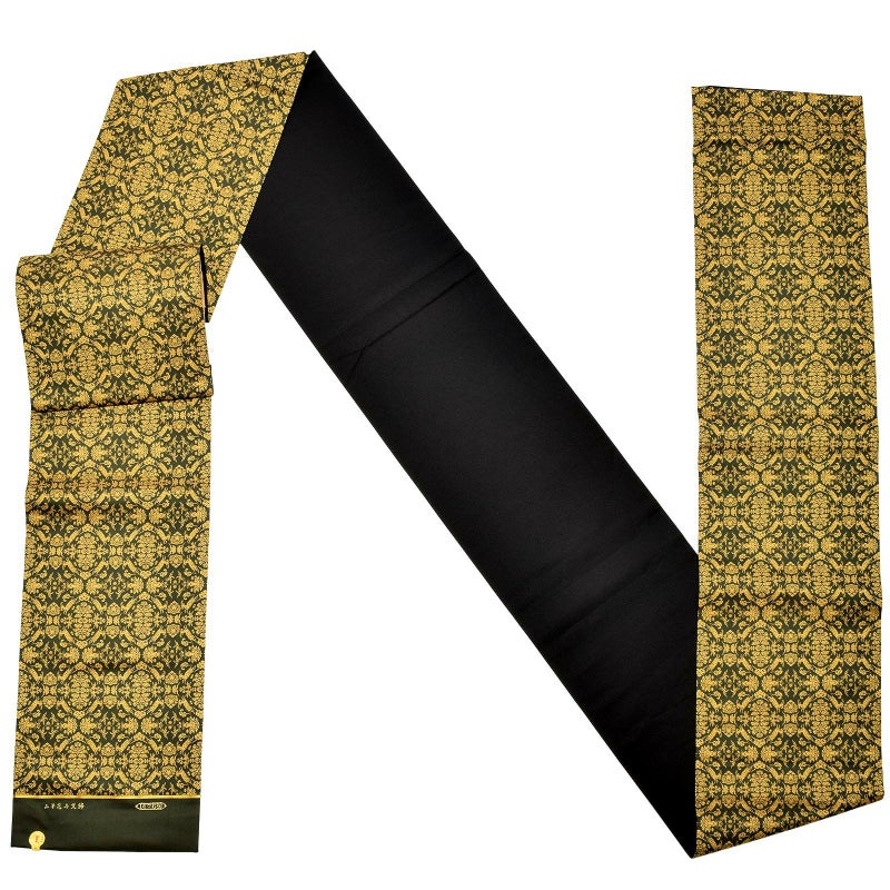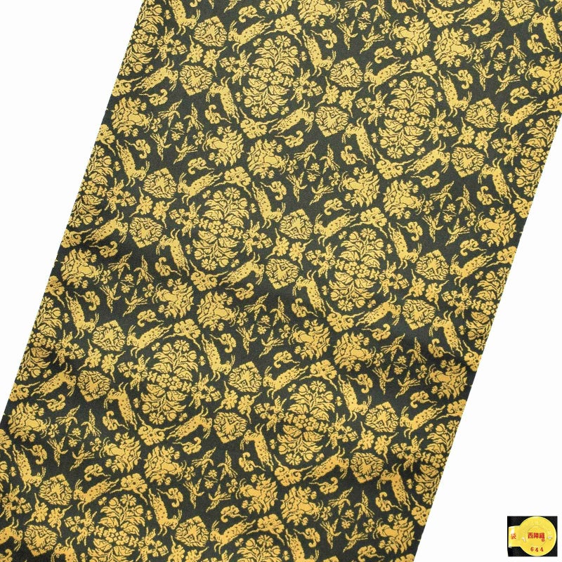 深いオリーブグリーンの地に芥子色の細かな文様の帯。花卉、それを囲む山羊と瑞雲、山岳や双鳥をシンメトリーに表現しています。正倉院宝物を原典に、奈良時代の文様構成で織り出した緻密な柄。2色だけの色彩が、動きのある巧みなデザインを引き立てます。