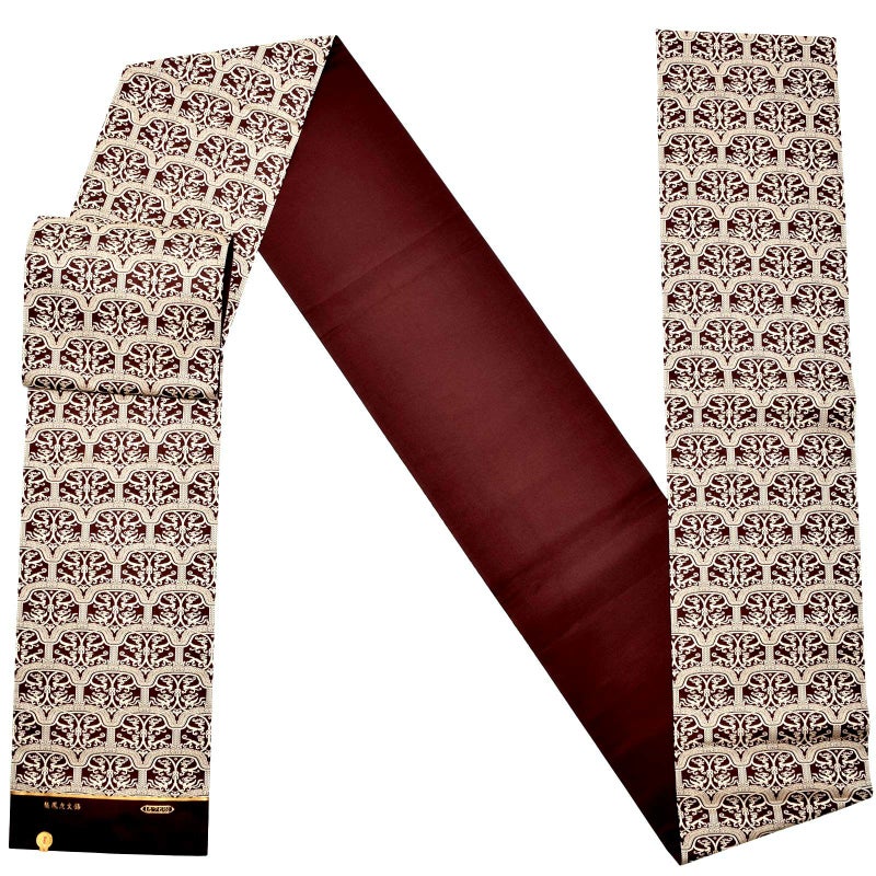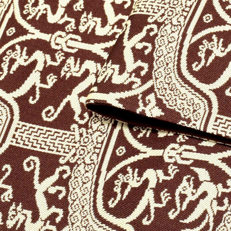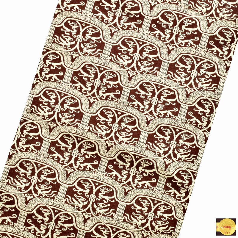 やや赤みの茶色の地に生成り色の文様の帯。大英博物館所蔵の英国の探検家がシルクロードより持ち帰った染織品が原典です。網目状の雲文様の下に龍文と鳳凰文・虎文が相対する文様です。後漢時代の荘厳な趣を織り成しました。