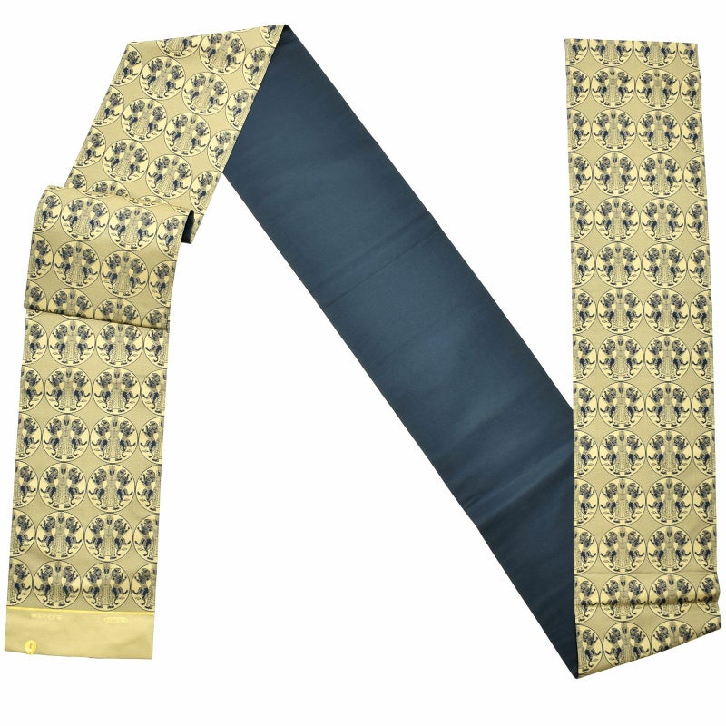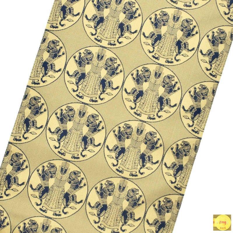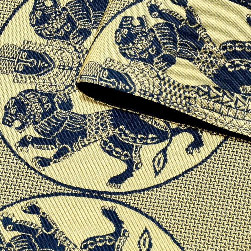 浅いカーキの地に紺の丸紋を中心とした帯。丸紋の中に表現されているのは、「ギルガメッシュ叙事詩」の主人公が両腕に獅子をとらえた姿。10世紀ころ、ヨーロッパへの輸出向けに織られた裂をもとに、古代の英雄の勇壮さと遠い歴史を感じさせる帯です。