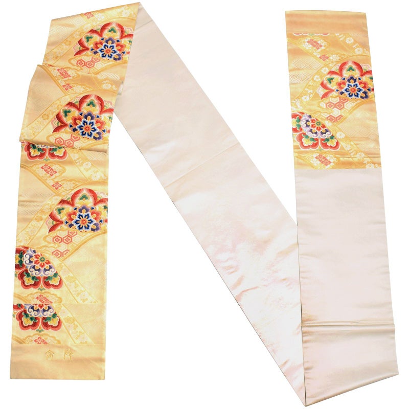 白く淡い輝きのゴールドの帯地。明るい金で斜めに帯がひるがえるように文様を配置した構成が、大胆で優美な印象です。金に白や浅い朱色の花唐草、花菱、亀甲などの小紋に、大きな華紋を組み合わせて。色は青に赤茶色、緑、くすんだ藤色など、落ち着いたやわらかい色彩でまとめています。上品で美麗ながら、大胆で印象的な雰囲気の帯です。