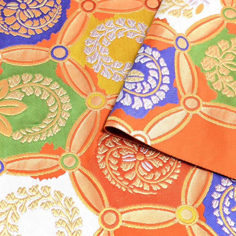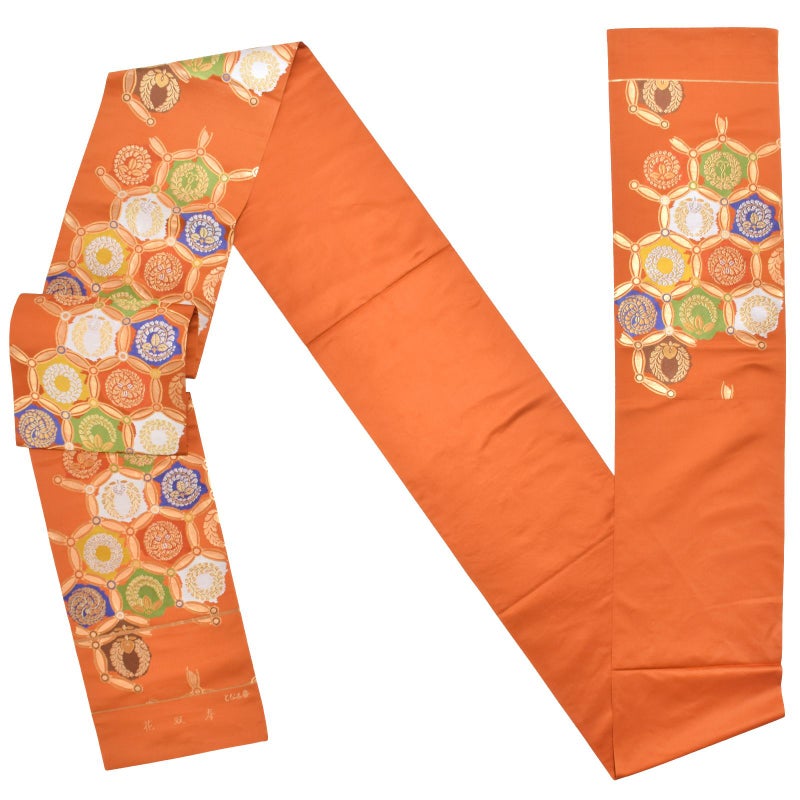 朱色の地に金の六角の輪繋ぎ文様。輪の中に、金や銀の下り藤、藤巴、九条藤などさまざまな藤紋を入れ込んだ帯です。ややくすんだ赤や、青、白、緑など全体的に落ち着いた配色がレトロな印象。