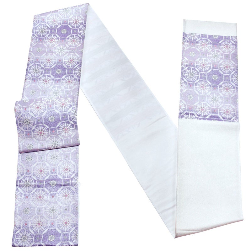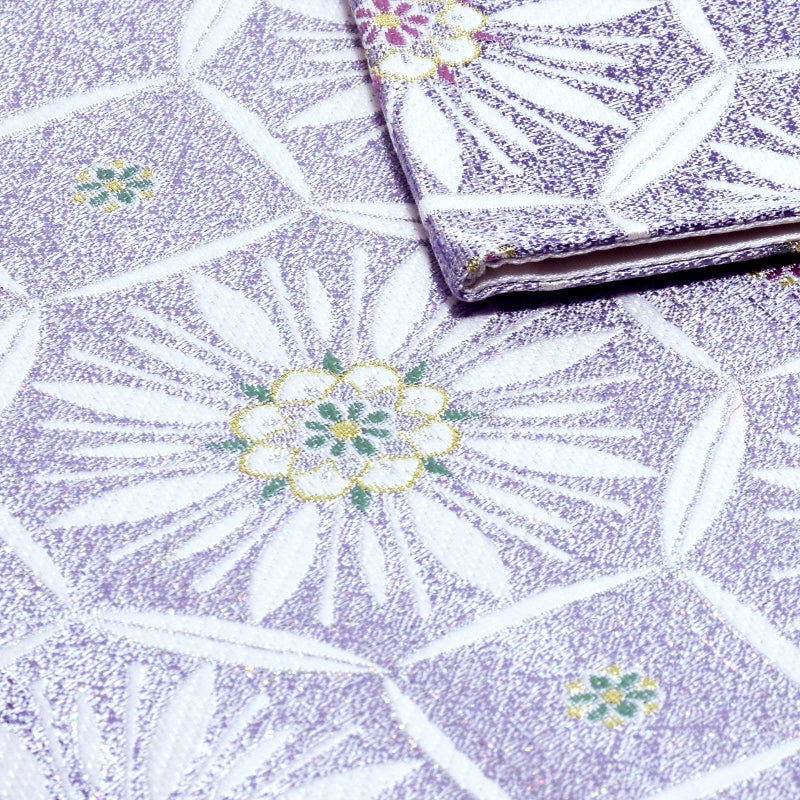淡い灰色地に藤色を横段にぼかしたように織り出した地。特殊な箔と金銀糸や色絹糸を巧みに使用した変わり綴れの織物です。まるでさざなみのようにキラキラと繊細に輝きます。図柄は現代的にアレンジされた華紋と、四角と八角形を組みわせた蜀江文様。白を基調に、浅緑色や薄紫色など。モダンですっきりと華やかな雰囲気です。