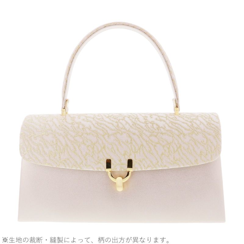 バッグの蓋と持ち手、草履の鼻緒と芯の巻きは、ごく淡い生成り色の地に金のマーブル模様。淡く虹色の光沢があり、上品な高級感。バッグの口金は金。バッグの受け、草履の台は、梨地のような細かな金の輝きのある淡いグレーベージュ。
