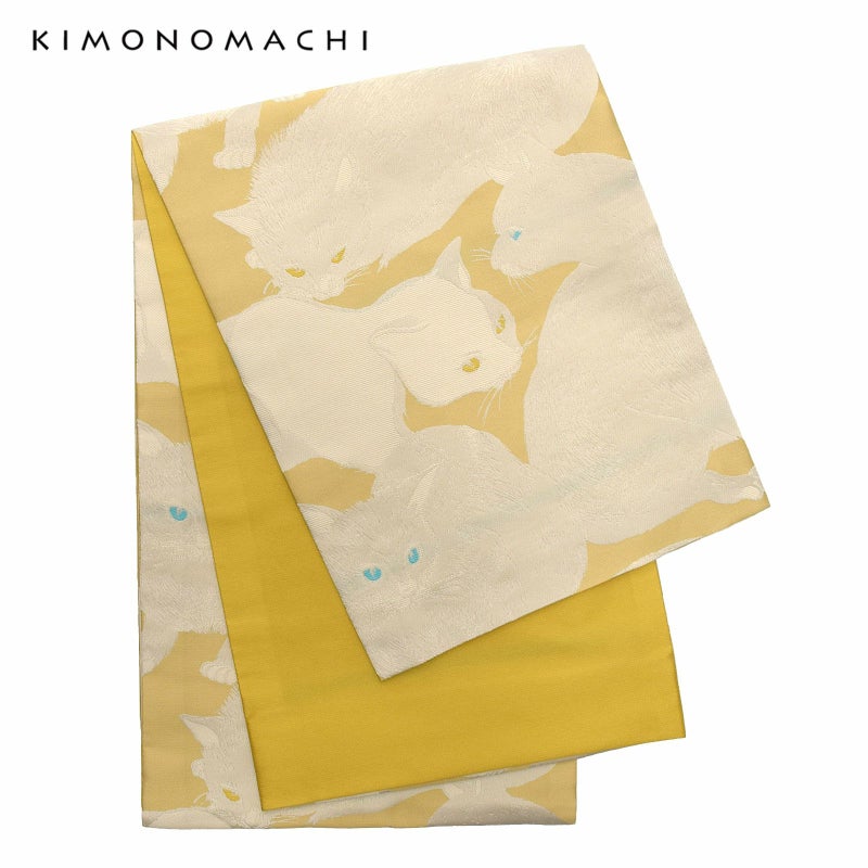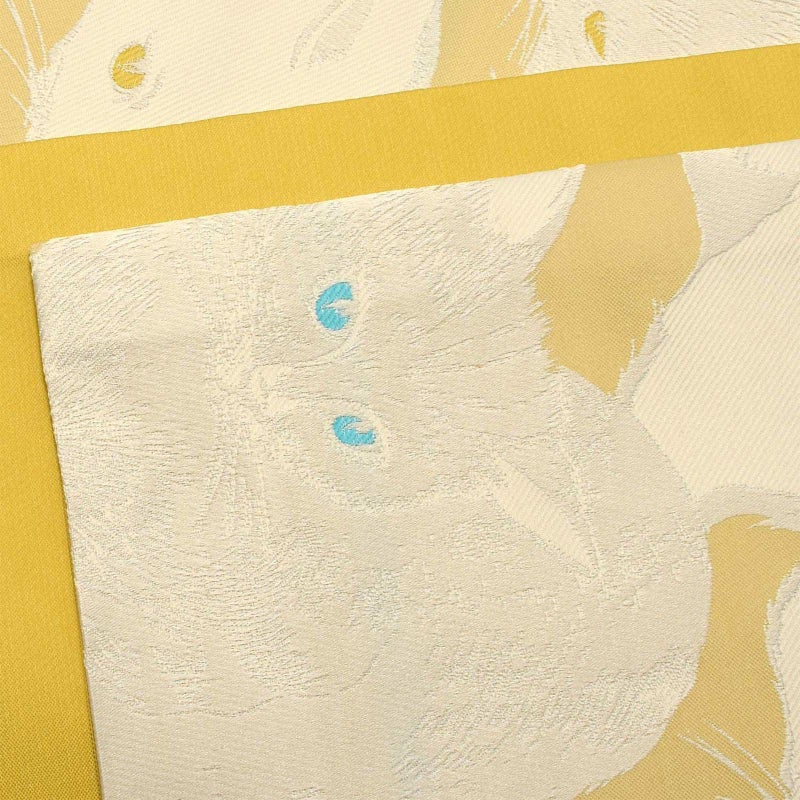 ややグレイッシュな淡い黄色地に、ターコイズブルーとイエローの目を光らせる白猫の姿。光の加減で浮き上がるような艶のある毛並みまで繊細に表現されています。日向の光の中で思い思いに過ごす猫たちの瞬間の表情を切り取ったかのような、リアルな姿が魅力的です。猫好きさんへ自信を持っておすすめする、美しい猫の帯です。