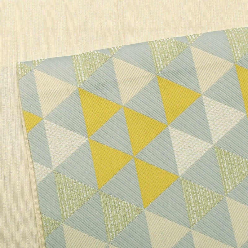 灰色みのある淡い水色の地に、やや灰みの明るい黄色を中心とした鱗模様の帯。地の色と模様の三角形が交互に構成されたうろこ文様。シンプルな連続模様ですが、白や淡いベージュ、淡い緑色など色や織りに変化をつけており、単調な印象になりません。全体的に淡いグレイッシュな色合いで、優しくさわやかな雰囲気です。