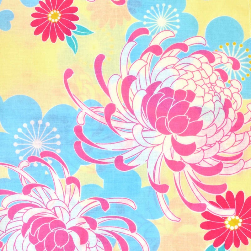 淡い黄色に水色のシルエットで表現された梅。白と浅い赤紫色の乱菊。ターコイズグリーンの葉。