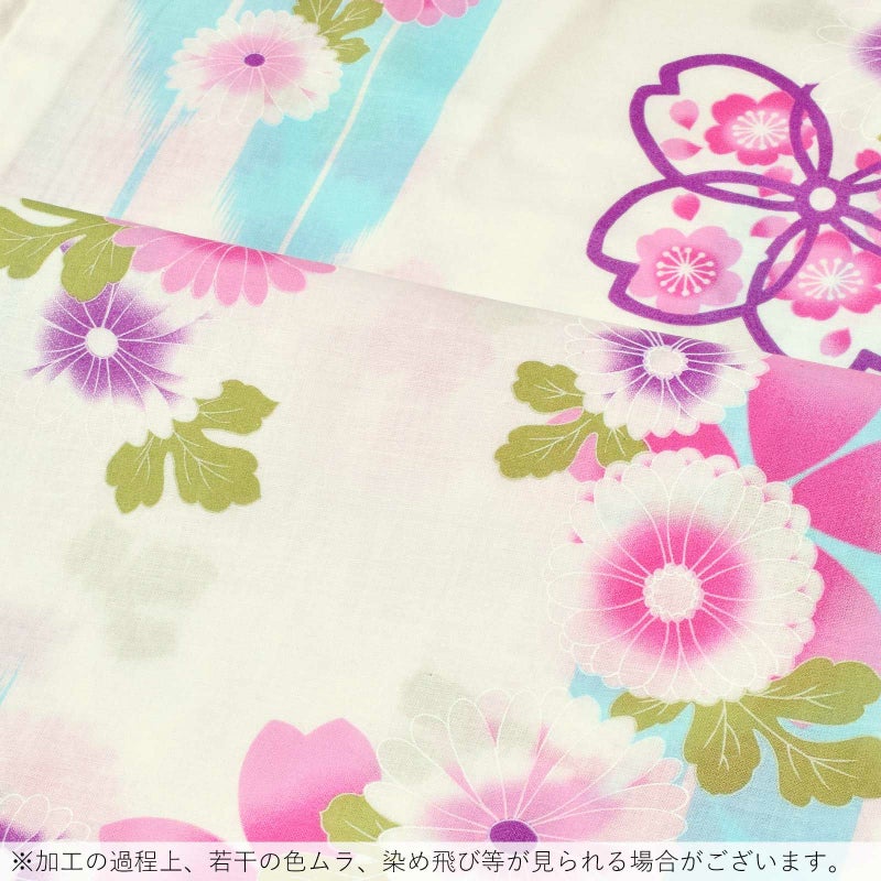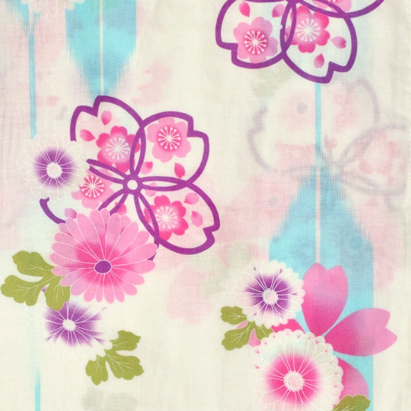白地に水色の矢羽根の柄、菊の花や桜の模様。淡い赤紫を基調に、ややくすんだ紫、ピンク、浅い黄緑色。