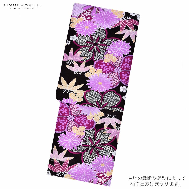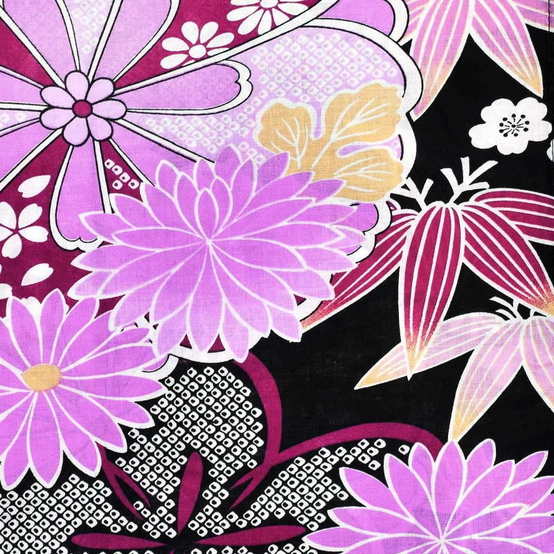 黒地に白と藤色や赤紫を基調とした花紋。桜に菊や笹、鹿の子の模様。