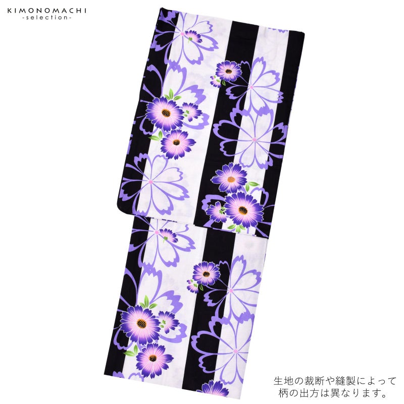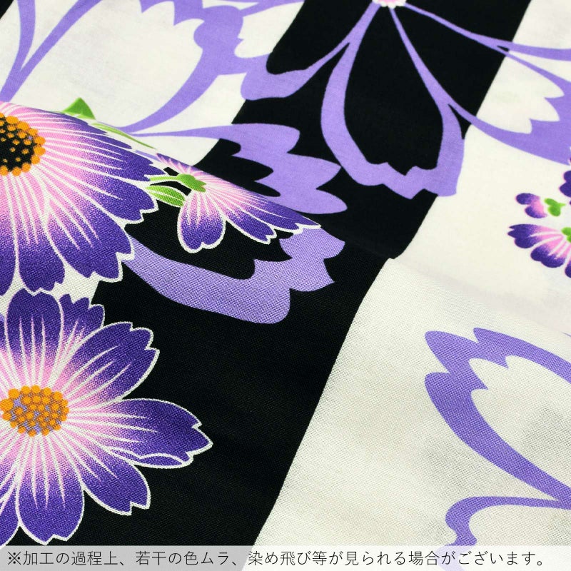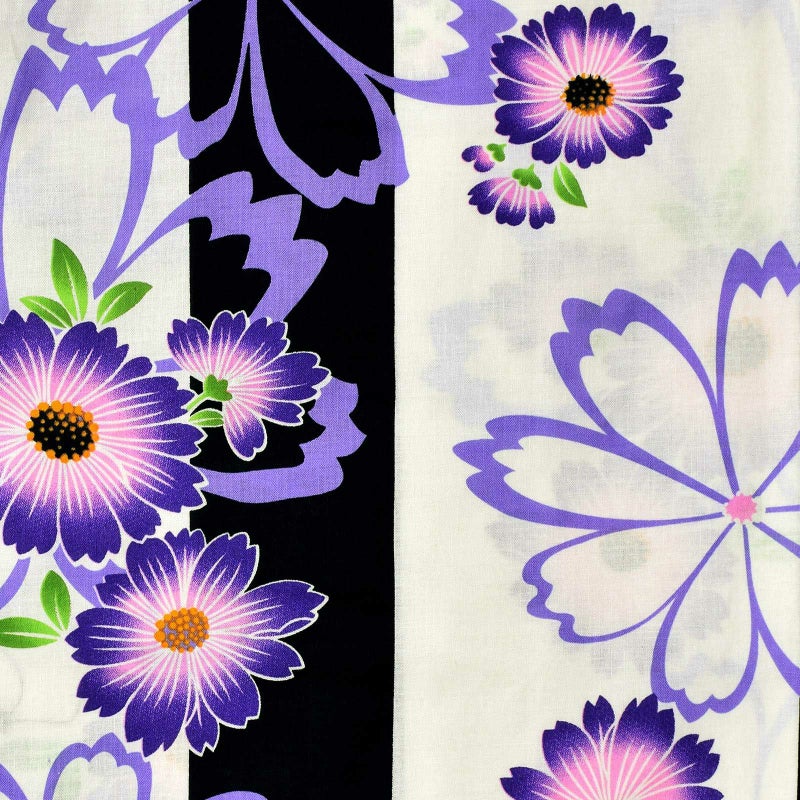 黒とオフホワイトの縦縞の地にマーガレット風の花模様。藤色のラインや、青紫色とピンク、明るい黄緑、深緑色など。