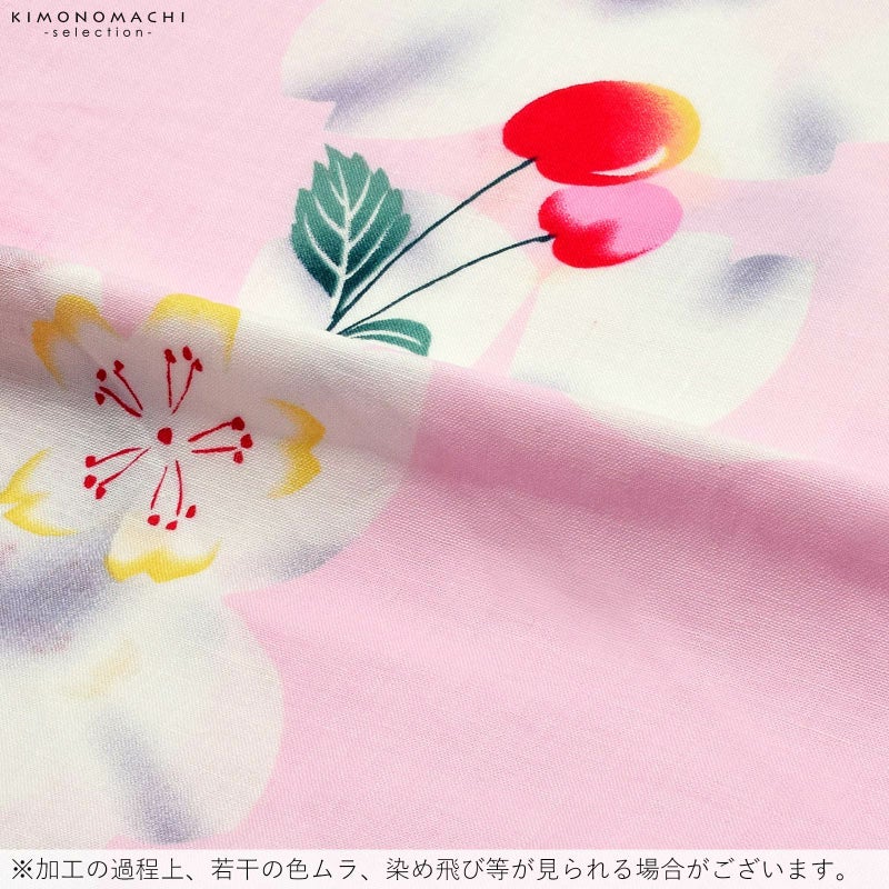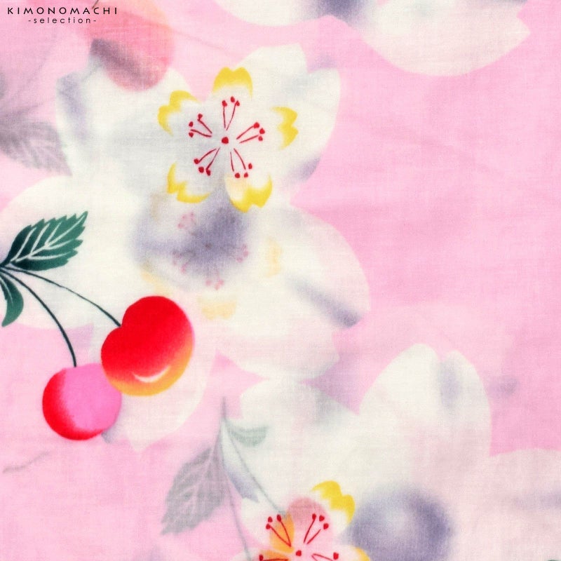 明るい薄ピンクの地に、白とグレーの桜の花のシルエット、サクランボの柄。白に黄色の花と、赤にピンク、黄色のサクランボ、緑の葉。