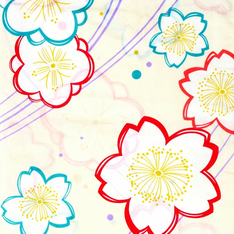 【カラー】明るい薄クリーム色の地に、イラスト調の梅や桜の花紋。浅い藤色の曲線、ターコイズ系の水色、藤色、からし色のドット。深い紅色、サーモンピンク、水色の輪郭線に白の花。