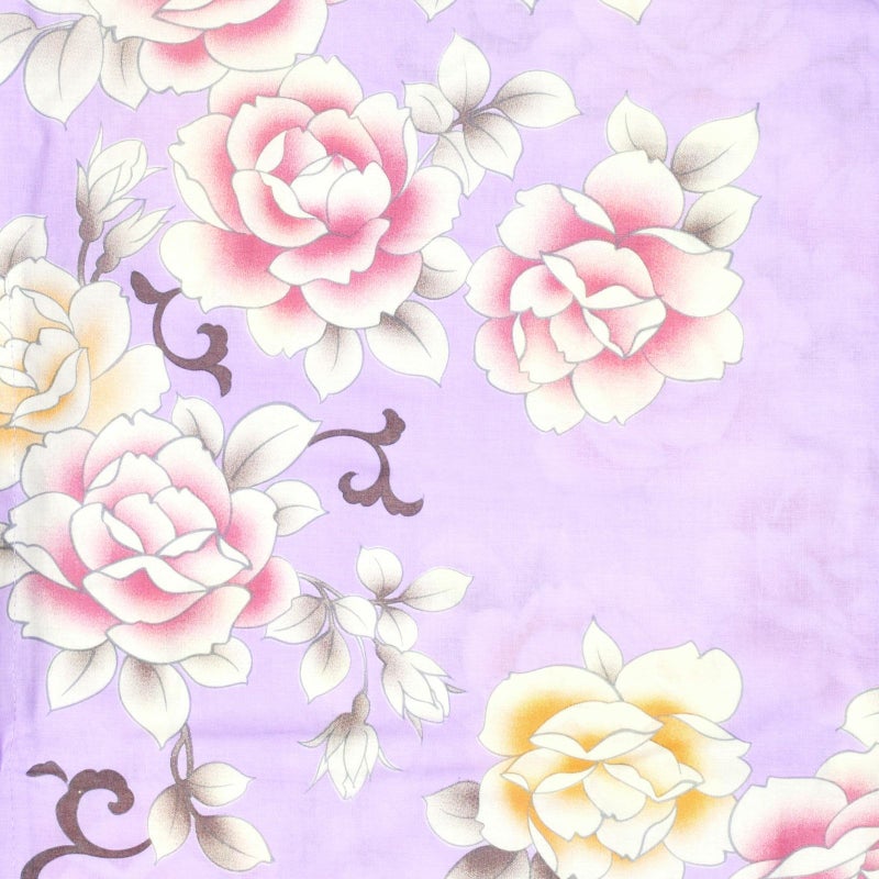 【カラー】落ち着いたパープルの地に、グレーの線で描かれた薔薇の花模様。白に淡い赤紫や山吹色、チャコールなど。