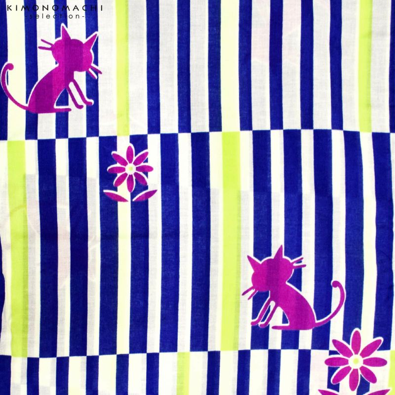 【カラー】オフホワイトと青、明るい黄緑のストライプの地。赤みの紫色の猫やお花。
