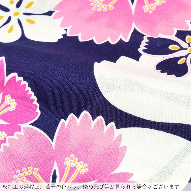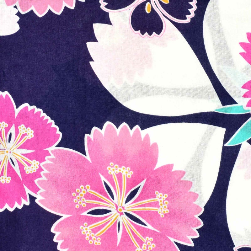 【カラー】紺地に白い桜のシルエット、ピンクや浅い赤紫色の撫子の花。ポイントに黄色、ミントグリーンの葉。