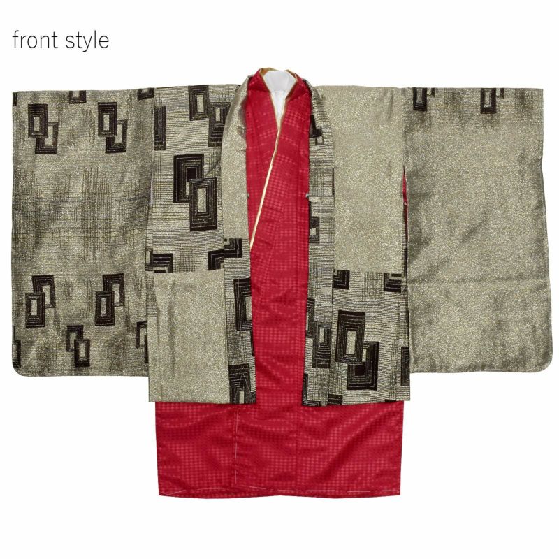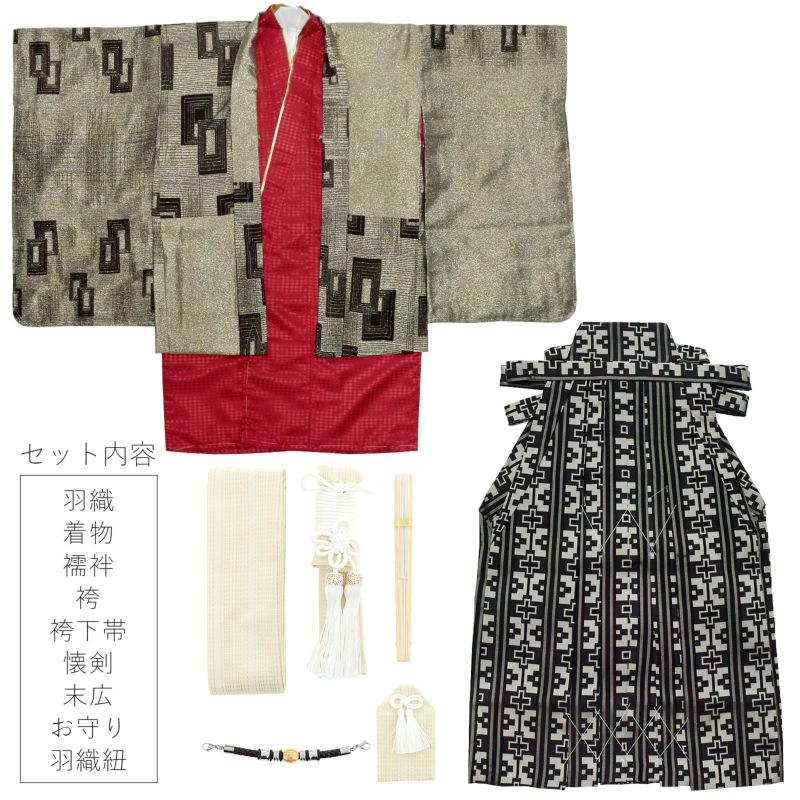 羽織は全体的にキラキラと輝きのあるアッシュゴールドの地に、黒の細い線で不規則な格子、こげ茶と黒の四角を組み合わせた模様。着物は菱形の地模様に深い赤。白の襦袢と金の重ね衿がついています。袴は黒地にグレーの十字を組み合わせた模様です。アイボリーの地に金のラインの帯とお守りセット。