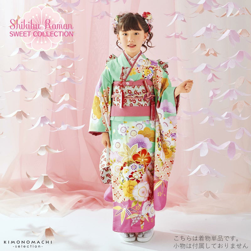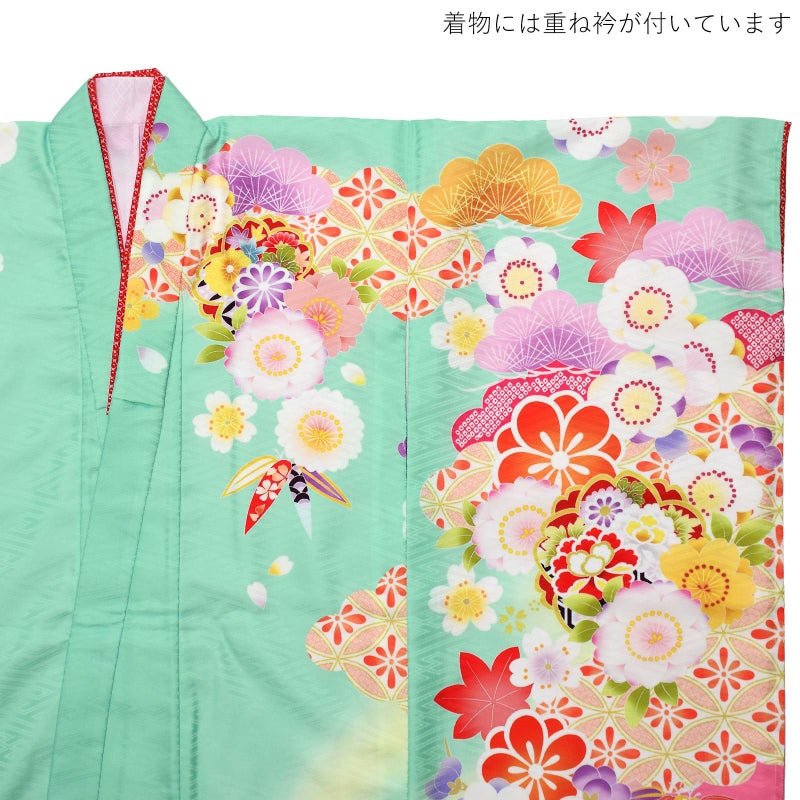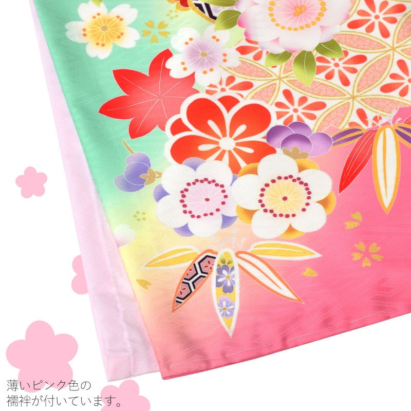【色柄】ミントグリーンと淡いクリーム色のぼかしの地。裾は明るいピンク。オレンジ色の七宝模様や、薄紫、芥子色、深い橙色、淡いピンクなどの松竹梅に桜楓文、赤い牡丹と色とりどりの華やかな着物です。ポイントに金の刺繍。袖口や裾のふき、重ね衿は赤い鹿の子。薄ピンクの襦袢。現代的で軽やかな色遣いが可愛らしい晴れ着です。