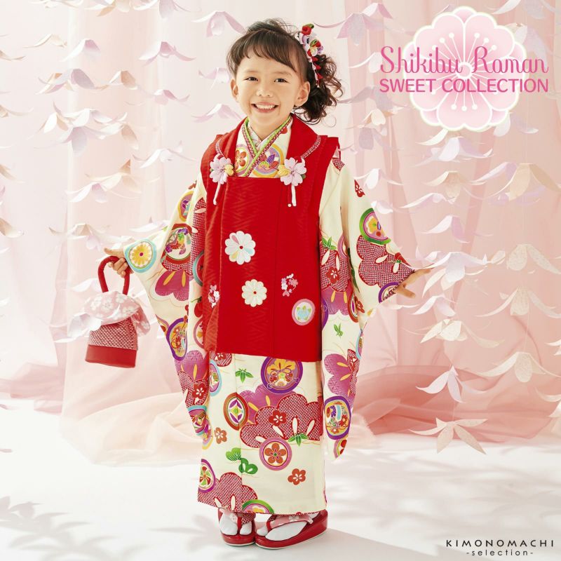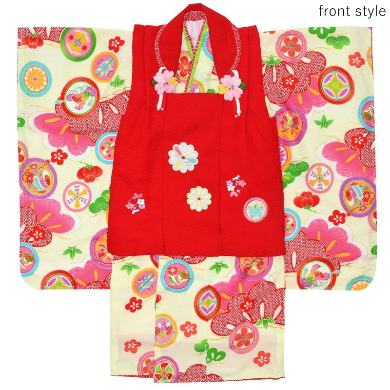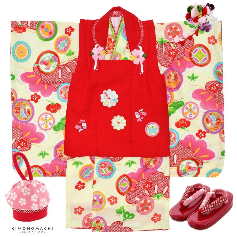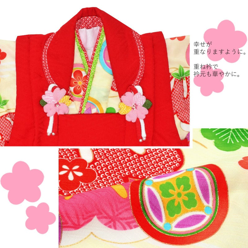 【色柄】被布コートは紗綾形の地紋のある赤。白やピンク、水色の花の刺繍。被布飾りはピンクのつまみのお花。着物は紗綾形の地紋に淡いクリーム色の地。赤い鹿の子と明るいピンクの松の柄、宝尽くしの丸紋。明るい藤色やピンク、水色、緑などのにぎやかな色遣いです。重ね衿は赤と黄緑の二枚重ね。袖口、裾のふきは赤い鹿の子模様。草履は赤い台に赤い鹿の子模様とピンクの桜の鼻緒。巾着は赤の袋にピンク色地の桜の柄の返しがついています。ピンクや赤、紫色のつまみのお花の髪飾り。