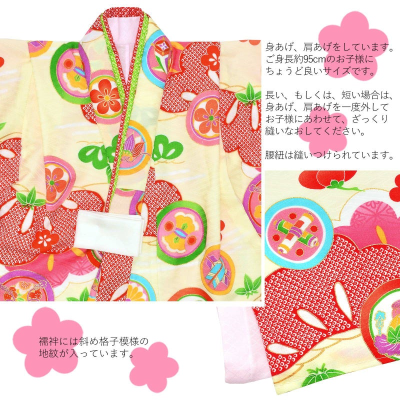 ※着物はすでに身上げ、肩上げが施されています。3歳のお祝いをするお子様の平均身長に合わせて、身長95cmぐらいのお子様がぴったりと着ていただけるサイズになっています。もしそれでは大きい、もしくは小さいようでしたら身上げ、肩上げを一度解いていただいて、お子様に合わせて、再度縫い上げてください。