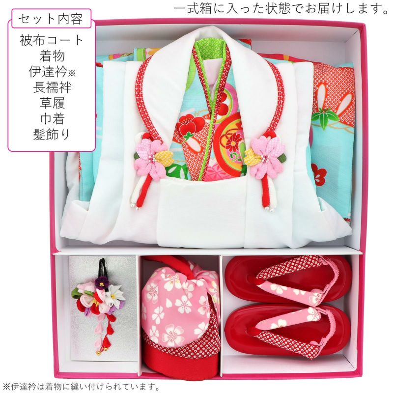【商品内容】被布コート・着物・長襦袢・伊達衿・草履・巾着・髪飾りの計7点セット(伊達衿はすでに着物に縫い付けてあります)+刺繍半衿と足袋プレゼント