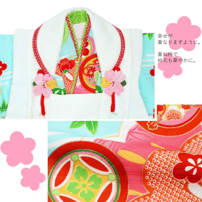 【色柄】被布コートは紗綾形の地紋のある白。白や薄黄色、水色の花の刺繍。被布飾りはピンクのつまみのお花。着物は紗綾形の地紋に淡い水色の地。オレンジ色の鹿の子と明るいピンクの松の柄、宝尽くしの丸紋。赤色やピンク、淡い橙色、緑などのにぎやかな色遣いです。重ね衿は黄緑と赤の二枚重ね。袖口、裾のふきは赤い鹿の子模様。草履は赤い台に赤い鹿の子模様とピンクの桜の鼻緒。巾着は赤の袋にピンク色地の桜の柄の返しがついています。ピンクや赤、紫色のつまみのお花の髪飾り。