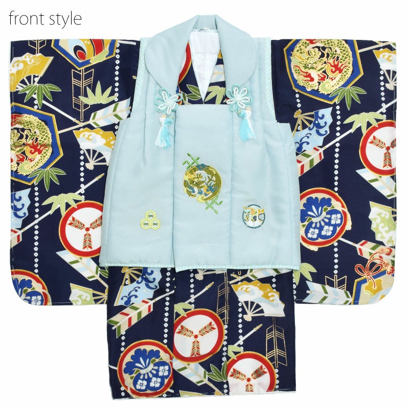【色柄】被布コートは水色。緑色系の龍の丸と矢羽、亀甲の刺繍。肩と裾に水色の鹿の子模様のふち取り。被布飾りは白と水色の組紐。着物は紺色地に扇子や竹、矢車や小槌の丸紋、龍と亀甲など。青系でまとめた中に赤や緑色の配色、金彩。着物と共生地の巾着、白い鼻緒の草履のセット。