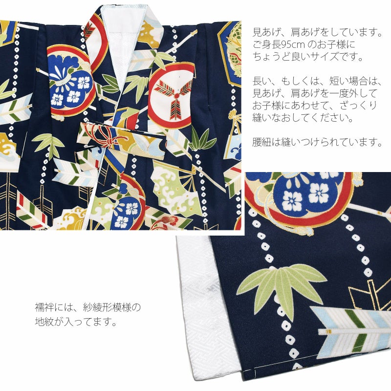 ※着物はすでに身上げ、肩上げが施されています。3歳のお祝いをするお子様の平均身長に合わせて、身長95cmぐらいのお子様がぴったりと着ていただけるサイズになっています。もしそれでは大きい、もしくは小さいようでしたら身上げ、肩上げを一度解いていただいて、お子様に合わせて、再度縫い上げてください。