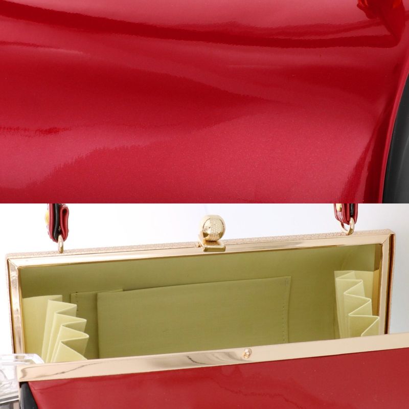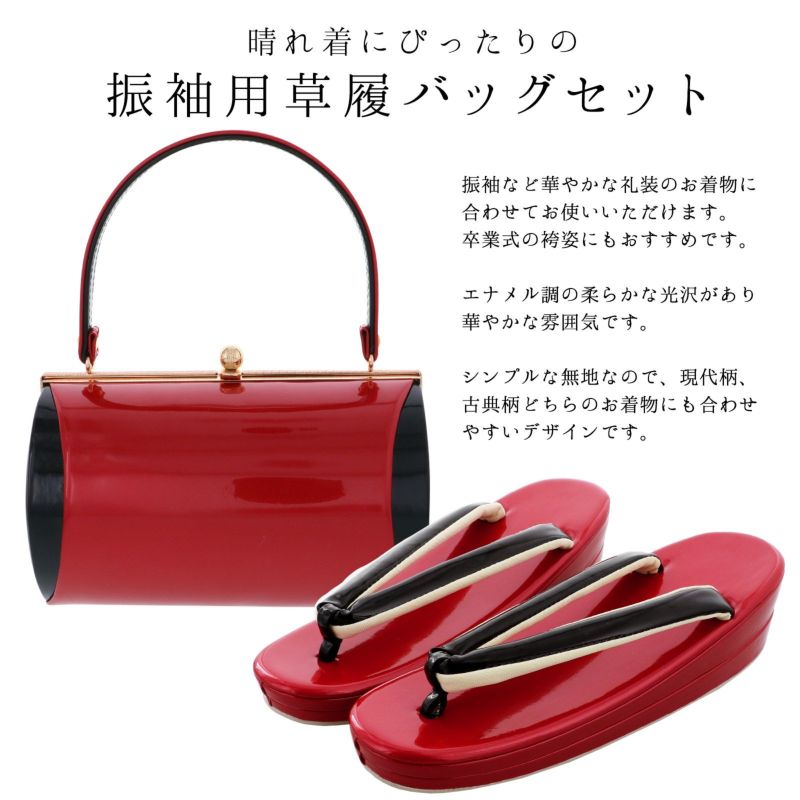 バッグの裏表、草履の台はつややかな深い赤。バッグ側面、鼻緒は黒。表の両サイドに黒。バッグの持ち手は表赤、裏黒。