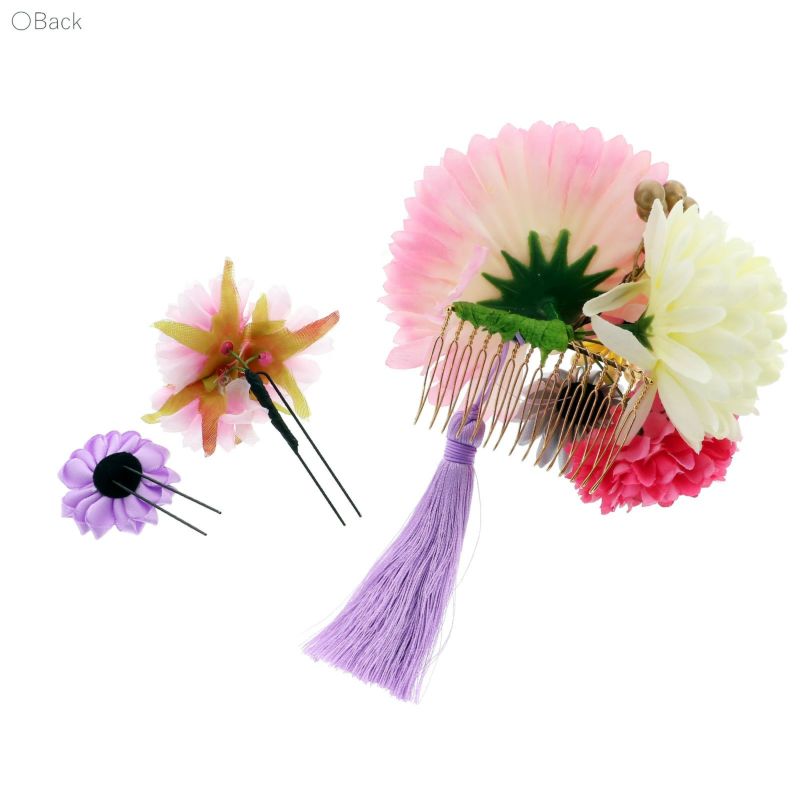 【カラー】コームは、明るいピンクのふんわりと大きなお花、淡いクリーム色の花、赤紫みのピンクの丸い花。淡いグレー、薄黄色、淡いピンクのリボンのつまみのお花。パープルのタッセル。白のパールビーズやラインストーン、金のチャームがポイント。Uピンは淡いピンクの丸いお花、薄紫色のリボンのつまみの花の2点。