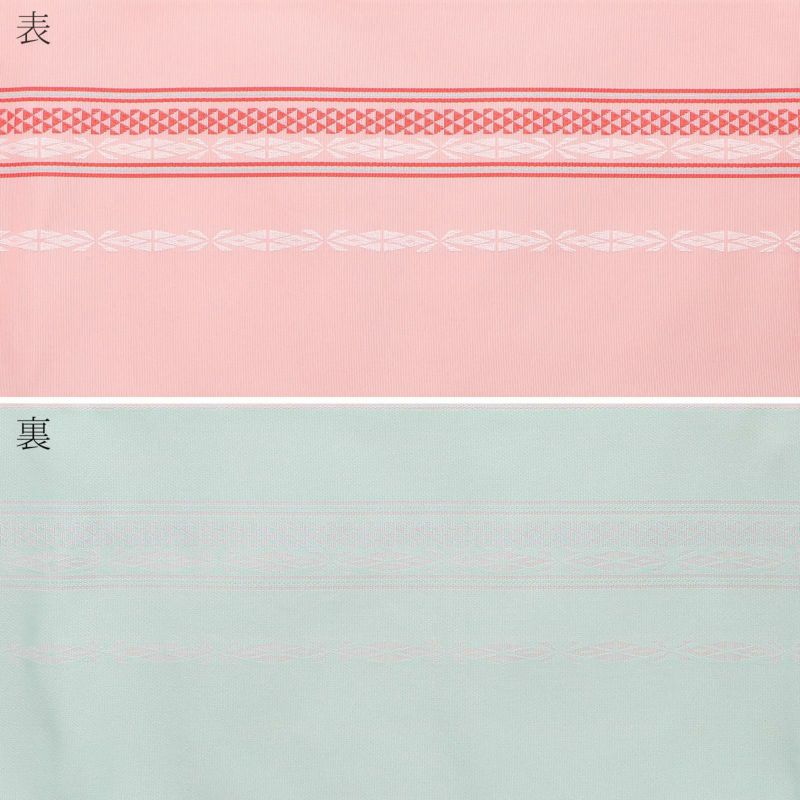 【カラー】淡いサーモンピンク色の地に、献上柄風の縞模様。白の幾何学模様、やわらかい朱色や鱗模様、水色の細い縞。裏は淡いグレイッシュな水色。