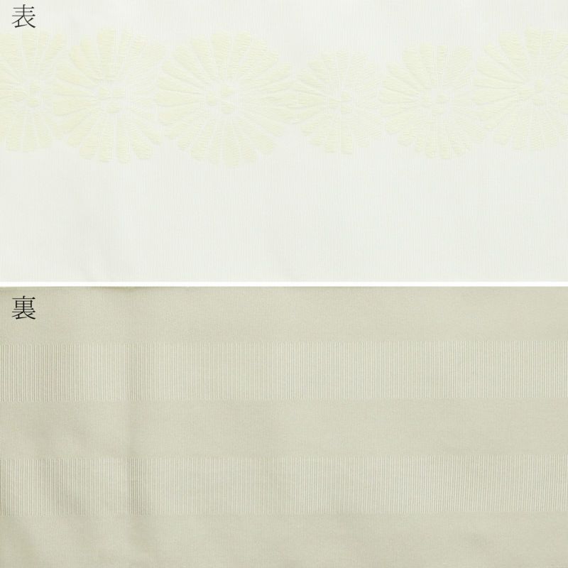 【カラー】アイボリー系の白に、ごく淡い黄色の花模様が並んだ帯。菊花のような唐松文様のような、シンプルながらどこか古典的な雰囲気のあるデザイン。裏は灰白色に織の二筋の縞。