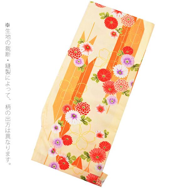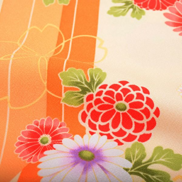 二尺袖着物:明るい薄いクリーム色地に、濃淡のオレンジ色の矢羽、菊花模様。