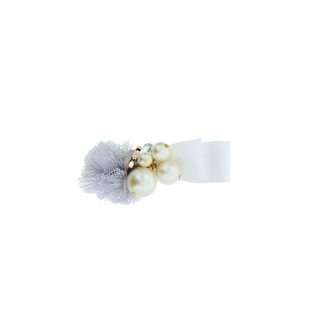 3白×グレー…白のグログランリボンに、クリーム色系のパールビーズやストーンチャーム。淡い青みのグレーのチュール。