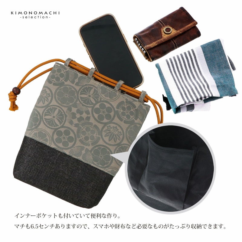 和装にぴったり!粋な和柄の信玄袋です。マチも6.5センチありますので、スマホや財布など持ち歩きに必要なものがたっぷり収納できます。内ポケットもついて使いやすい構造になっています。