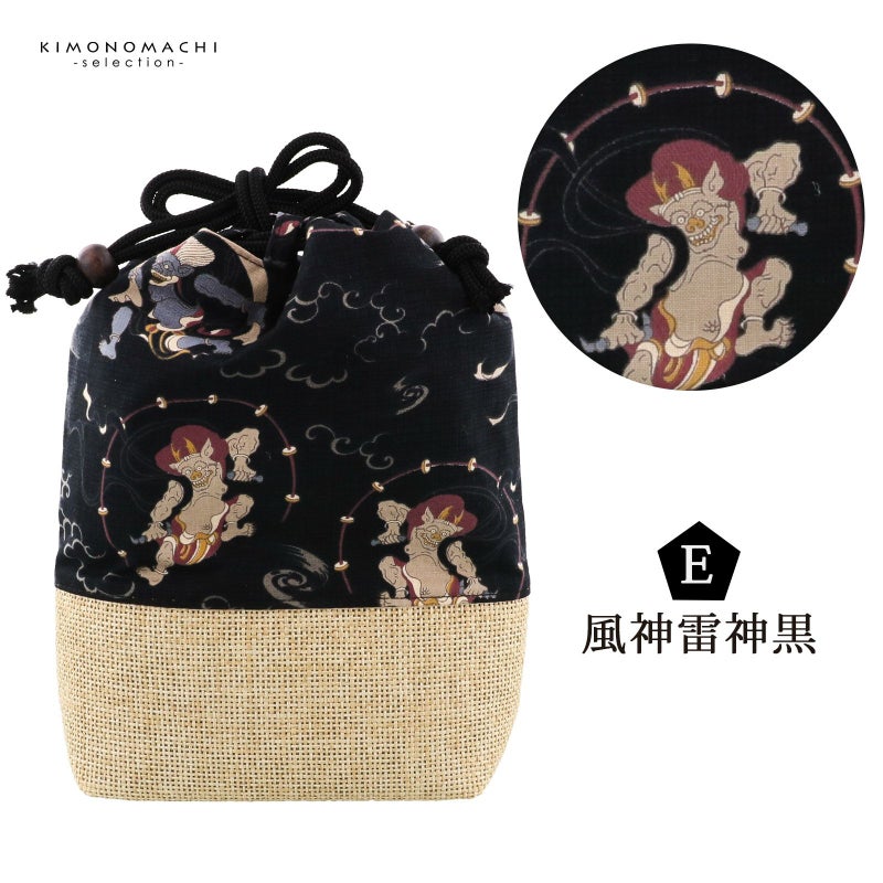 E黒地 風神雷神…黒地に、灰青やベージュ、赤茶色で表現された風神雷神にグレーの雲や渦の柄。底は生成り色の籠。持ち手は黒。