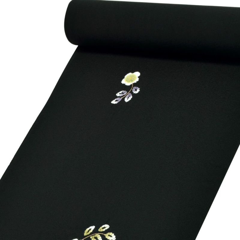 黒地に絞りで表現された梅の花、葉。白に深い桃色や、柳色、深紫色。金や山吹色の蕊。飛び飛びに配置されたお花が、控えめなかわいらしさを感じさせます。