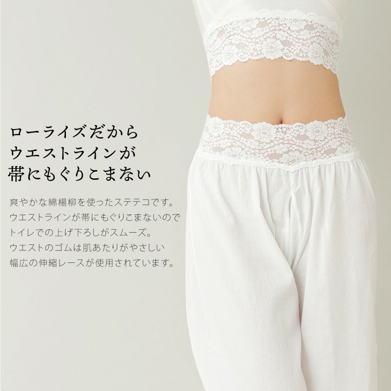 爽やかな綿楊柳を使ったステテコで、ウエストラインが帯にもぐりこまないのでトイレでの上げ下ろしがスムーズ。