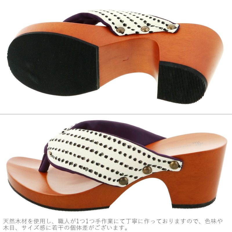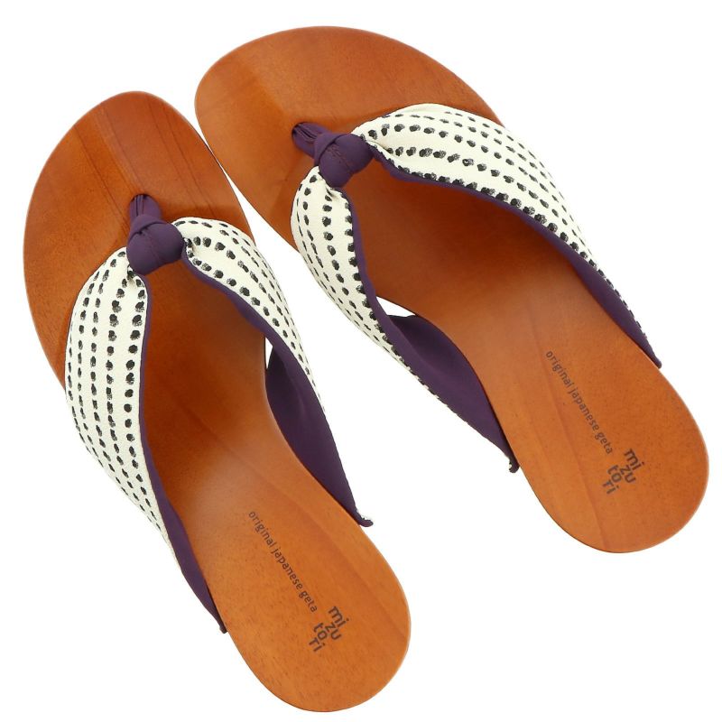 足形に添ったカーブのある、ヒールタイプの台。台の色は赤みのある自然な茶色。幅広の鼻緒は、白地に墨色のドット。裏地と前坪は深い紫。