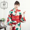 やや暗めのグリーンの地に、朱色、山吹色、白のレトロタッチの椿が表現されています。からし色の輪郭線に、青磁色や紺、深緑、黄緑の葉など個性的な色遣いの浴衣です。