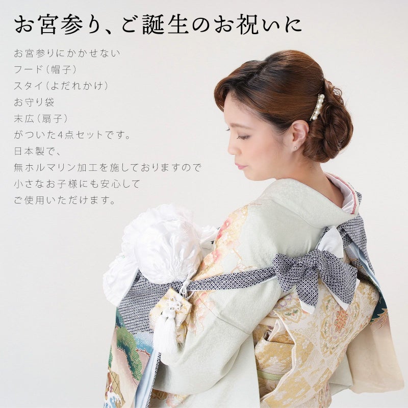 お子様、お孫様の健やかな成長を祈願するお宮参りにかかせない、フード(帽子)、スタイ(よだれかけ)、お守り袋、末広(扇子)がついた4点フードセットです。