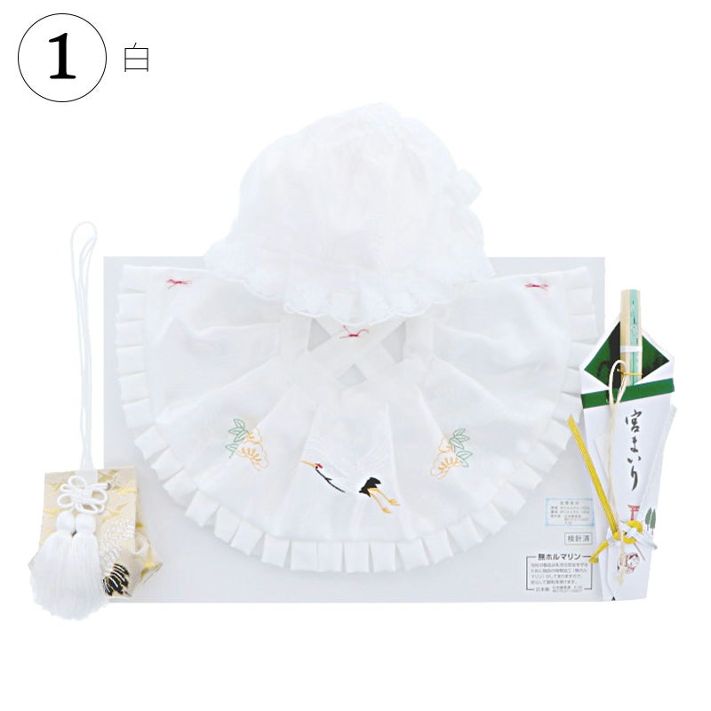 1.白(男の子用)…帽子、よだれかけは、白色。お守りは白×ゴールド系。