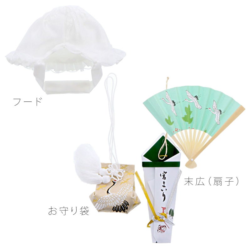 【商品内容】フード(帽子)、スタイ(よだれかけ)、お守り袋、末広(扇子)の4点セット