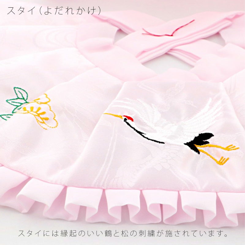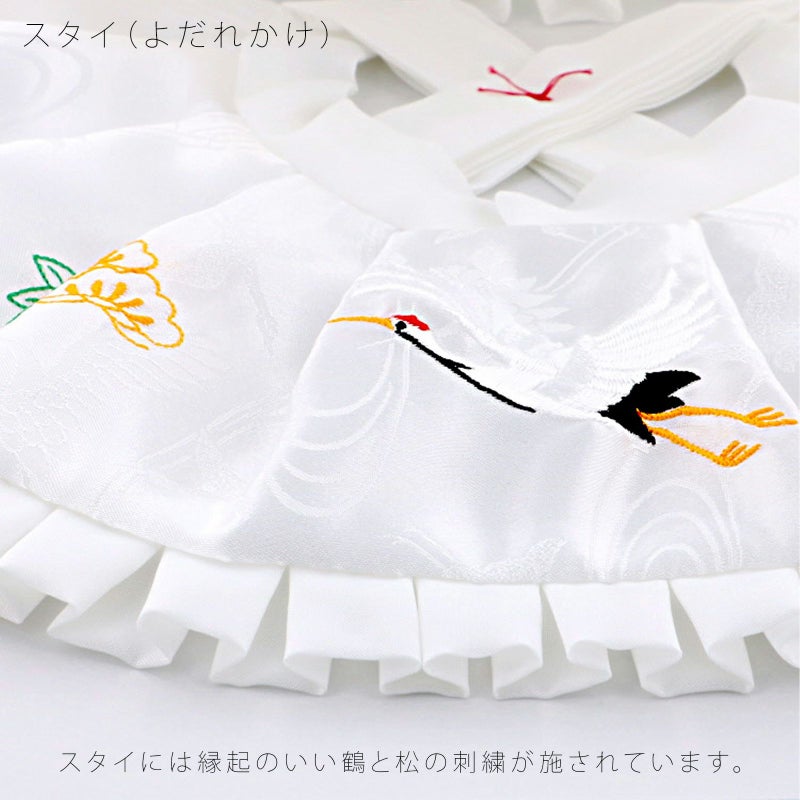 スタイ(よだれかけ)はフードと同じ長寿の象徴である鶴の地模様入り生地に、おめでたい鶴と松の刺繍も施されています。初着の上に出してご使用ください。