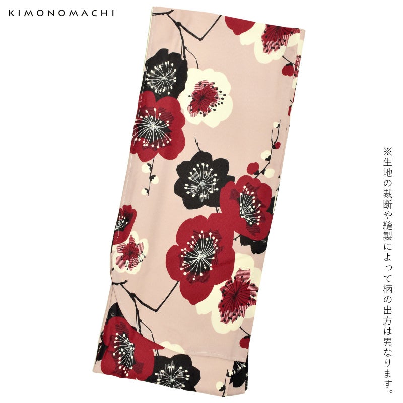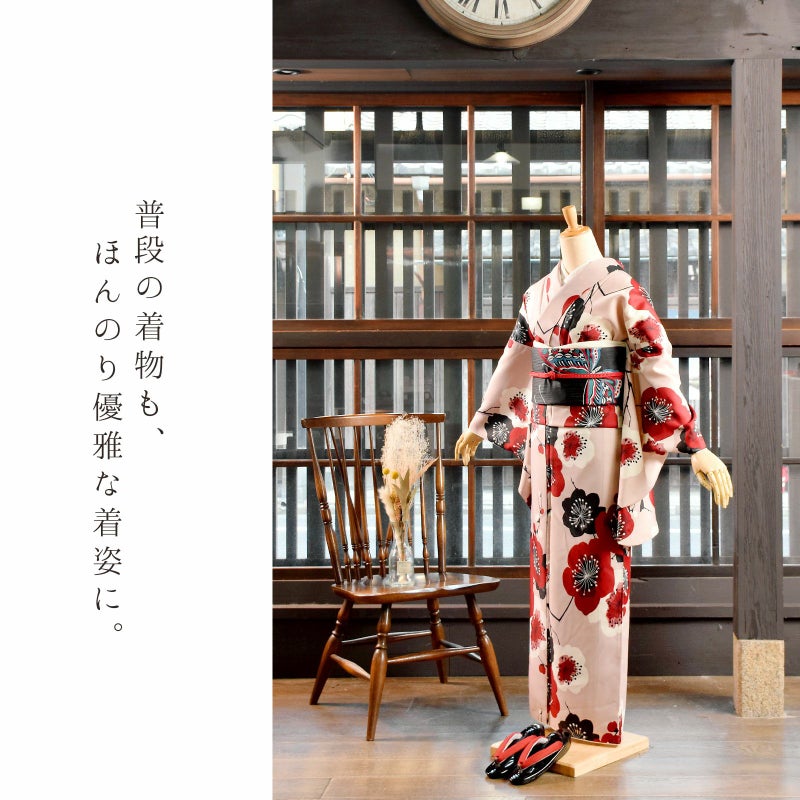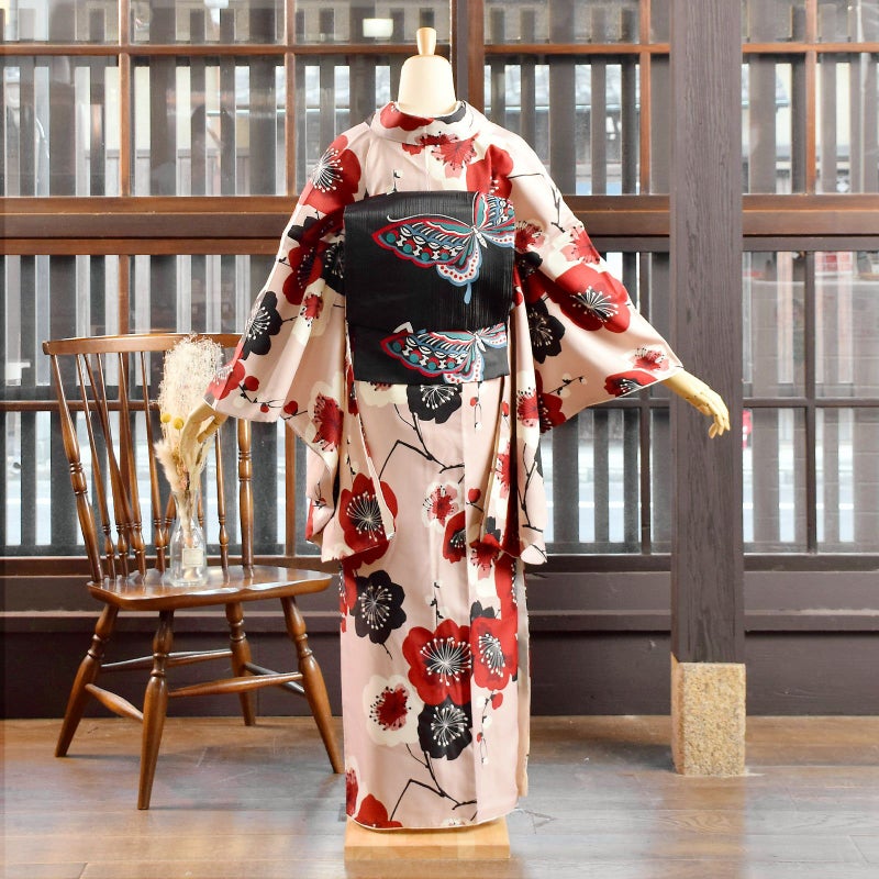 細かな地模様のある生地です。ややグレイッシュな落ち着いたピンクの地に、深い赤紅色、生成り色、黒の大胆な印象にデザインされた梅の花。花の中心は、ぼかしではなく線を重ねた表現となっています。直線的でエッジのある梅の花の形に、丸く古典的な雰囲気の枝やつぼみが懐かしさを添える、モダンでありながらレトロな魅力のある着物です。